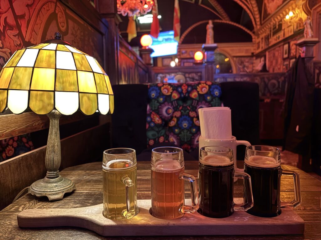 Wer die drei großen Craft-Adressen abgehakt hat, hat noch lange nicht alles gesehen. Im Rathauskeller am Rynek, mitten im Herzen der Altstadt, arbeitet seit 1992 das Spiż. Kupferkessel hinter Scheibe, Fermentationstanks einsehbar, neun Eigenbrausorten vom Jasne Pełne bis zum Miodowe-Honigbier. Wer hier zum ersten Mal bestellt, bekommt gratis dunkles Brot mit Schmalz – Hausbrauch und Einladung zur Gemütlichkeit zugleich. Das Spiż ist kein Craft-Tempel, aber ein authentischer Ort, der die alte Brauhaustradition am Leben erhält.