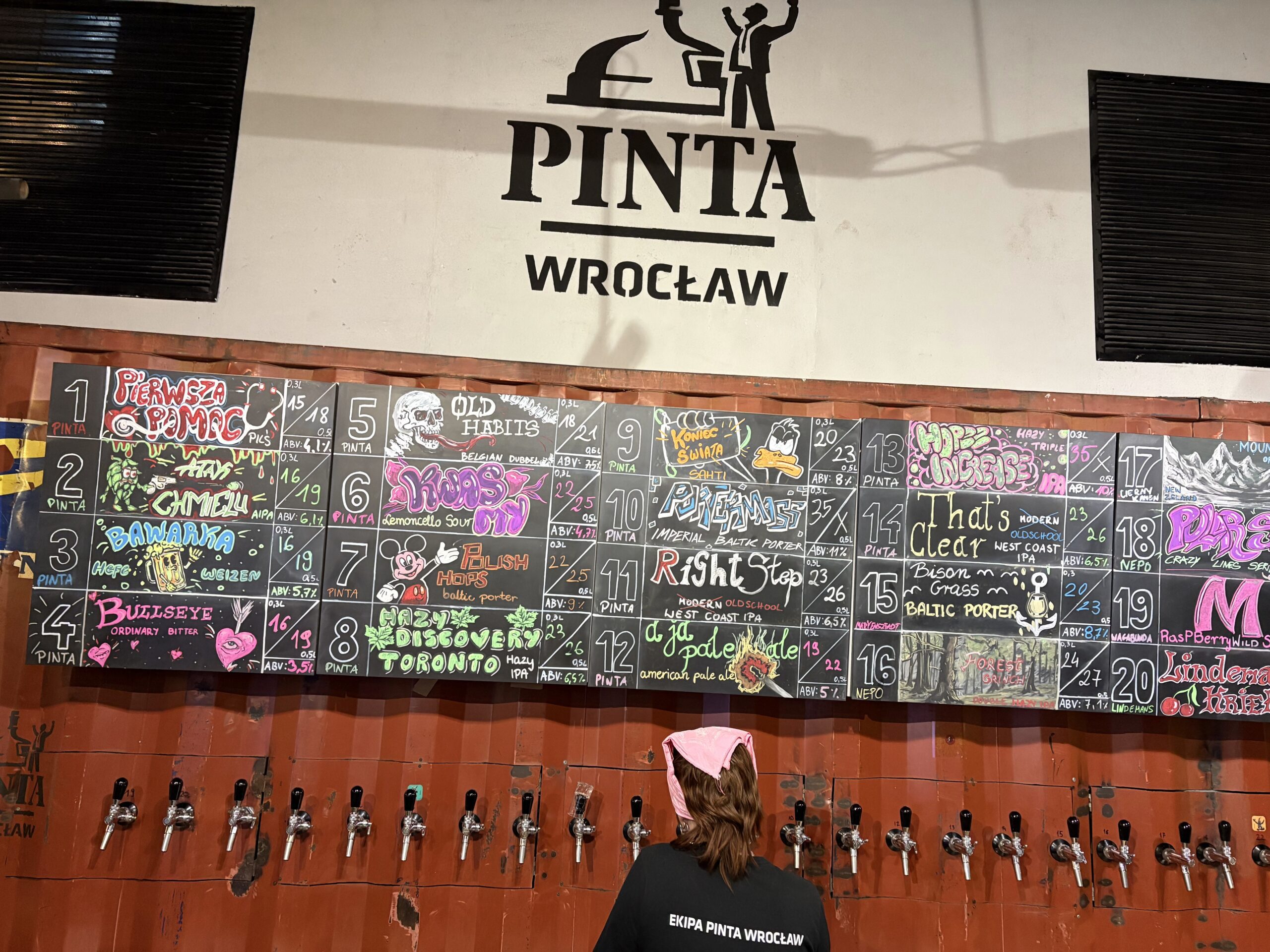 | PINTA Wrocław | Craft-Bar / Taproom ul. Podwale 83 (OVO-Gebäude) | Größtes Craft-Taproom Polens im beeindruckenden OVO-Hochhaus. 24 Zapfhähne, internationale Gäste-Biere, originelle Slow-Food-Küche. Pioniersatz: Hier debütierte PINTA 2011 mit Polens erstem IPA. | Atak Chmielu IPA (Polens erstes Craft-IPA, Ikone der Szene) |