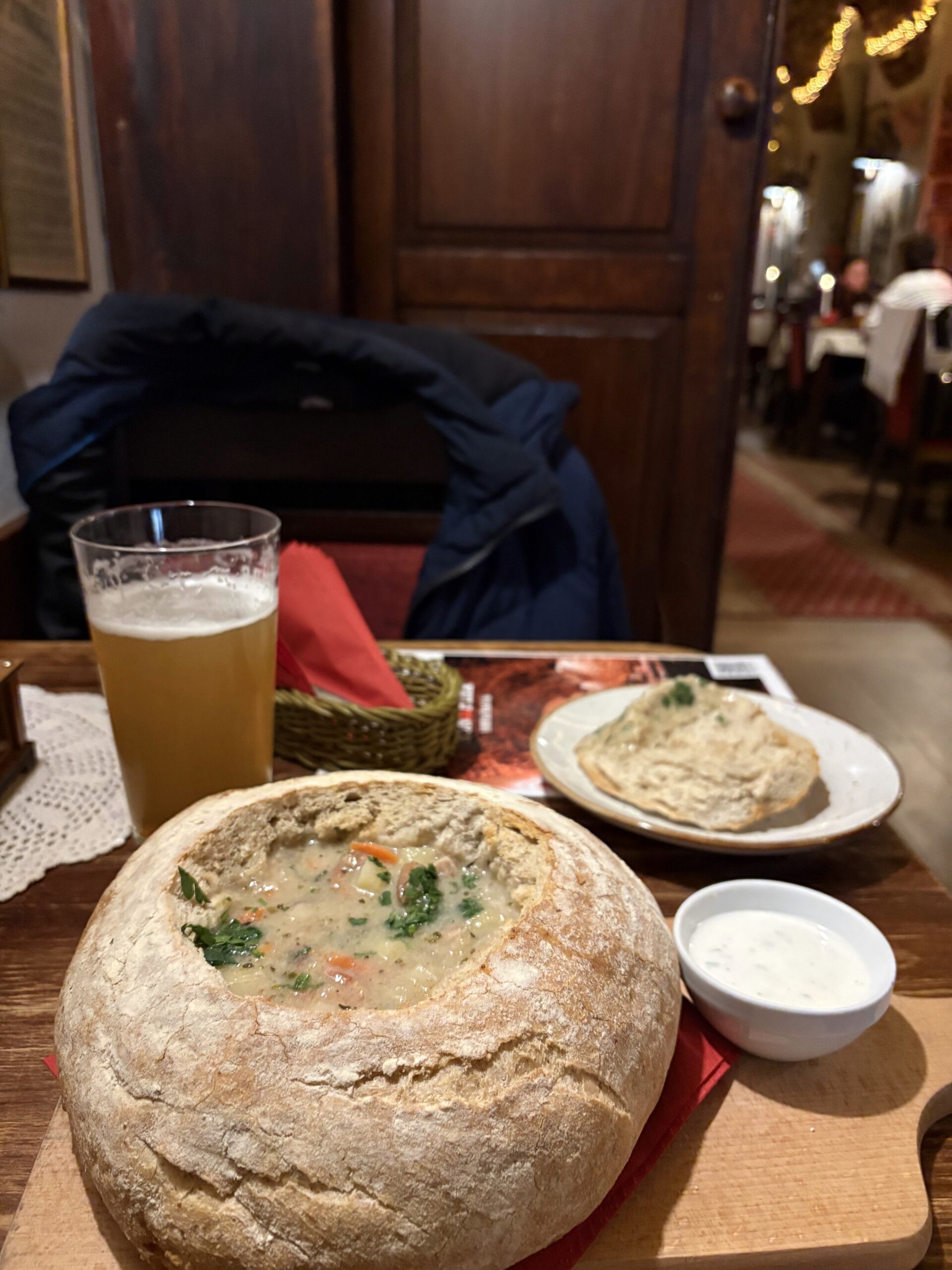 Wer die drei großen Craft-Adressen abgehakt hat, hat noch lange nicht alles gesehen. Im Rathauskeller am Rynek, mitten im Herzen der Altstadt, arbeitet seit 1992 das Spiż. Kupferkessel hinter Scheibe, Fermentationstanks einsehbar, neun Eigenbrausorten vom Jasne Pełne bis zum Miodowe-Honigbier. Wer hier zum ersten Mal bestellt, bekommt gratis dunkles Brot mit Schmalz – Hausbrauch und Einladung zur Gemütlichkeit zugleich. Das Spiż ist kein Craft-Tempel, aber ein authentischer Ort, der die alte Brauhaustradition am Leben erhält.