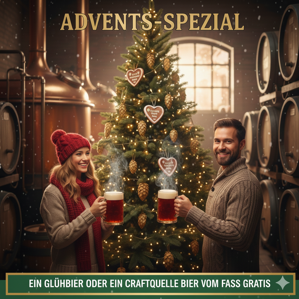 Für jeden der in der Adventszeit beim Werksverkauf Bier einkauft, gibt es außerdem entweder ein Glühbier oder ein Craftquelle Bier vom Fass gratis!